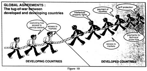 The developed countries lay a great deal of emphasis on freedom of access to markets of all countries of the world for service sectors, viz. banking, insurance, shipping, etc. They also seek to ensure proprietary advantages such as intellectual properties and the payments for patents and royalties for R & D investments made by them.